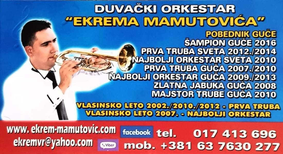 EKREM MAMUTOVIC ORKESTARŠampion Guče 2016Guča Međunarodno Takmičenje Prva Truba Sveta 2012 / 2014Najbolji Orkestar Sveta 2010 GučaPrva Truba 2007/2010Najbolji Orkestar 2009/2013Zlatna Jabuka 2008 Vlasinslo letoPrva Truba 2002/2010Najbolji Orkestar 2007Truba Publike 2012